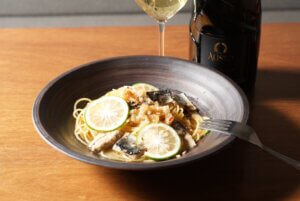 【アオリイカとカブ、カブの葉白味噌クリームパスタ】